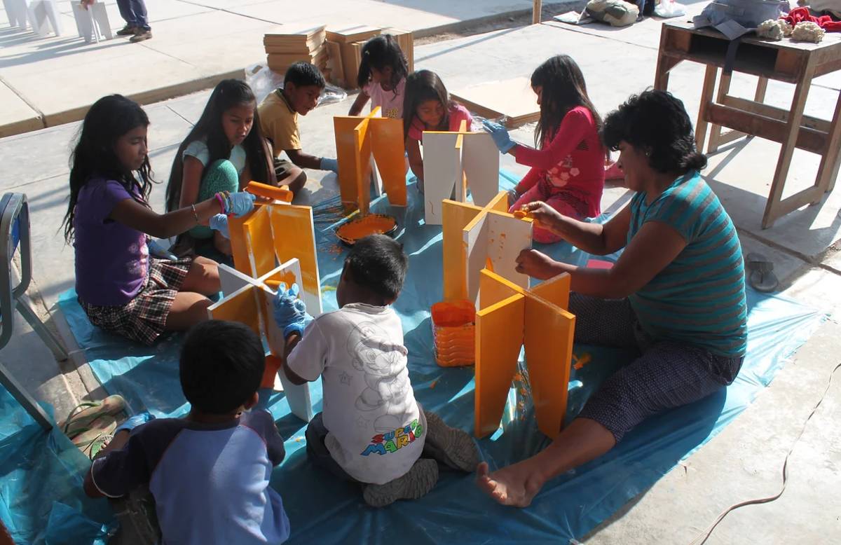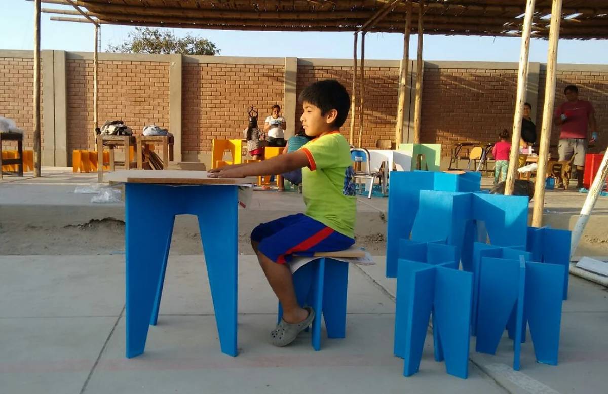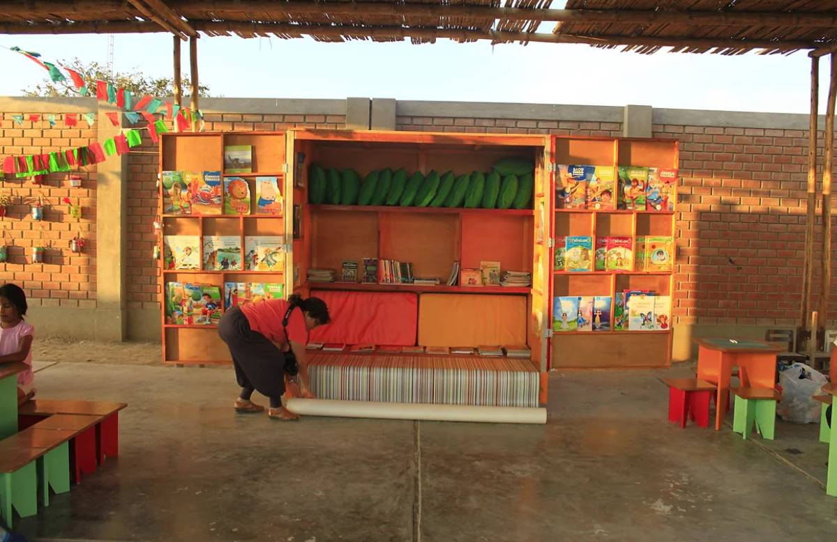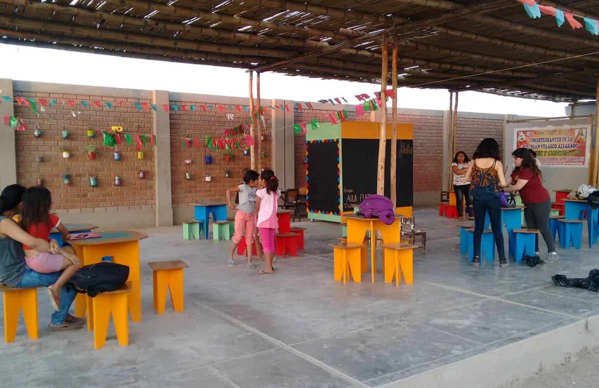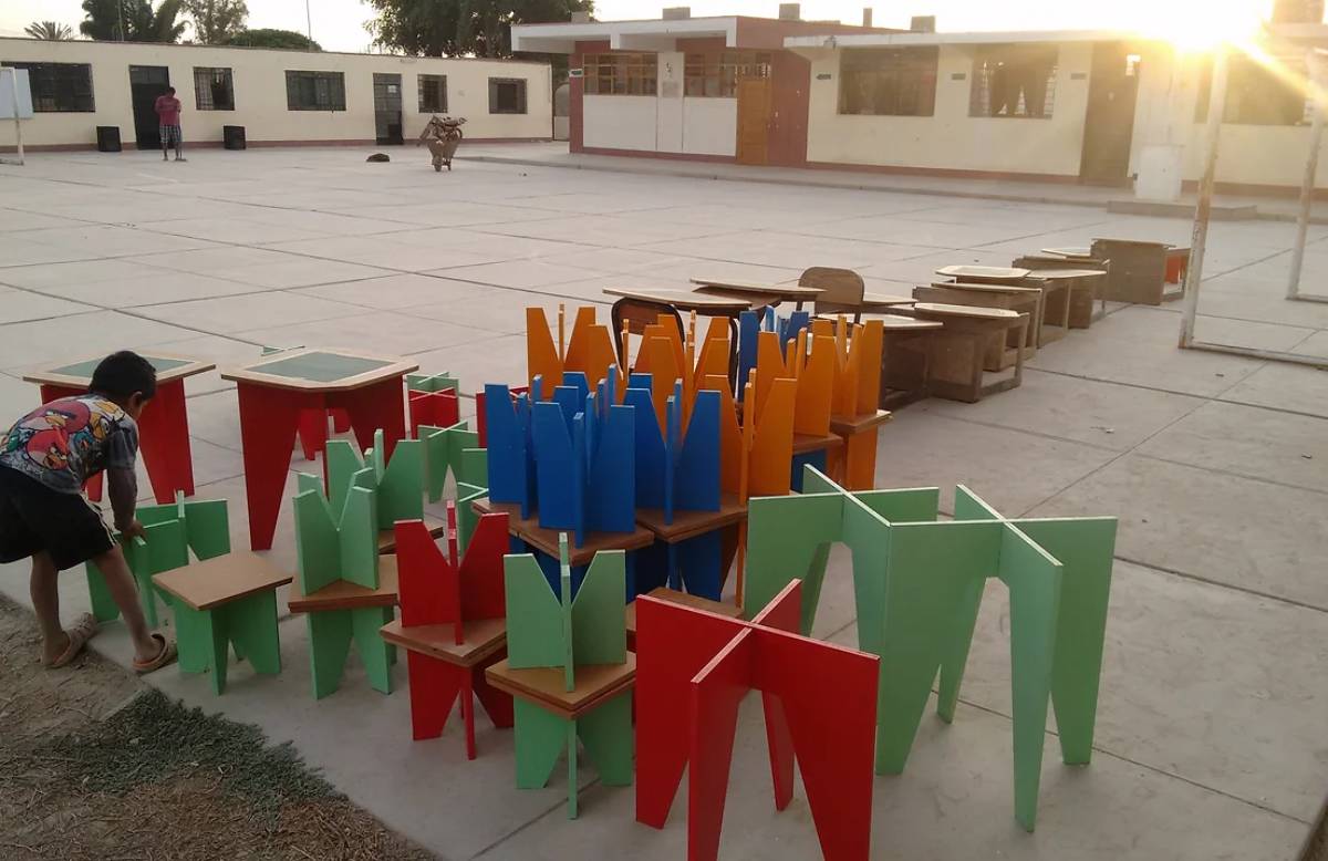 Se realizó un taller de Miniarquitectos con alumnos de 3ero a 5to grado de primaria con los cuales se reconoció la principal problemática del colegio, la falta de un espacio con las condiciones adecuadas para la toma de alimentos, ya que lo venían haciendo al aire libre sobre mobiliario en desuso (pupitres y bancas viejas o rotas). Identificado el problema se propuso a partir de sus ideas plasmadas en dibujos la elaboración de mobiliario lúdico de bancos y mesas fáciles de ensamblar, livianas, cómodas y “garabateables”. Así mismo se reusó un almacén de libros que por su mala ubicación no era usada por los niños, reciclando su estructura y convirtiéndola en una “retablo” que además de contener libros, al abrirse brindara cojines, juegos y fomentara la lectura al aire libre. La construcción del mobiliario se realizó junto a profesores, padres de familia y varios niños en 6 jornadas de trabajo.