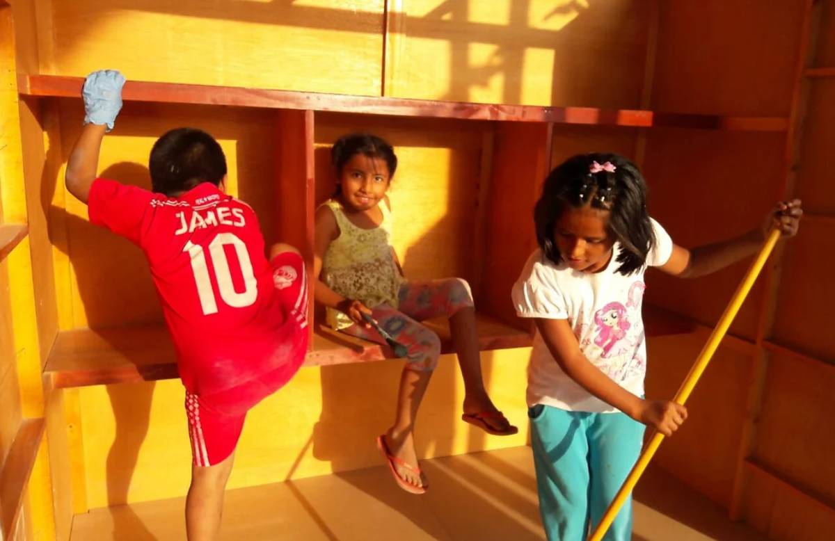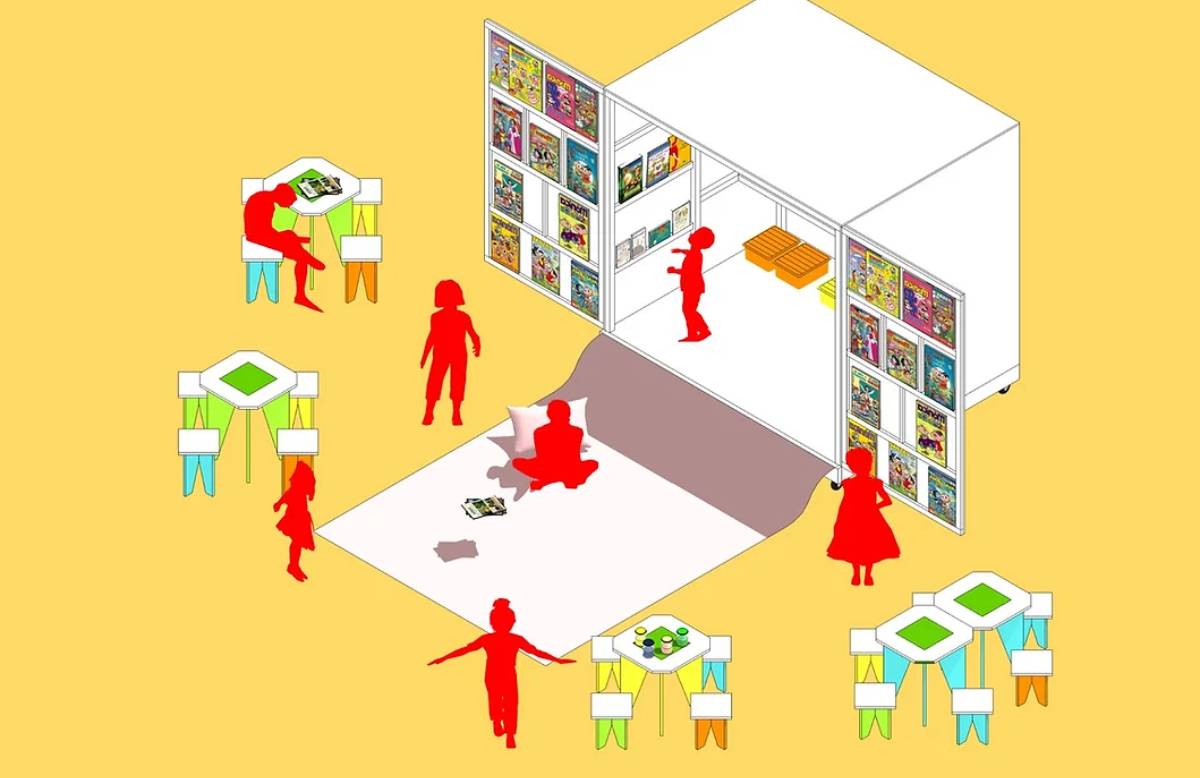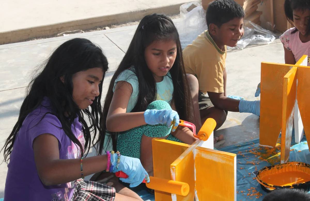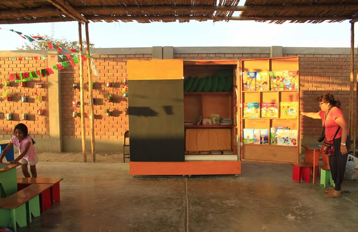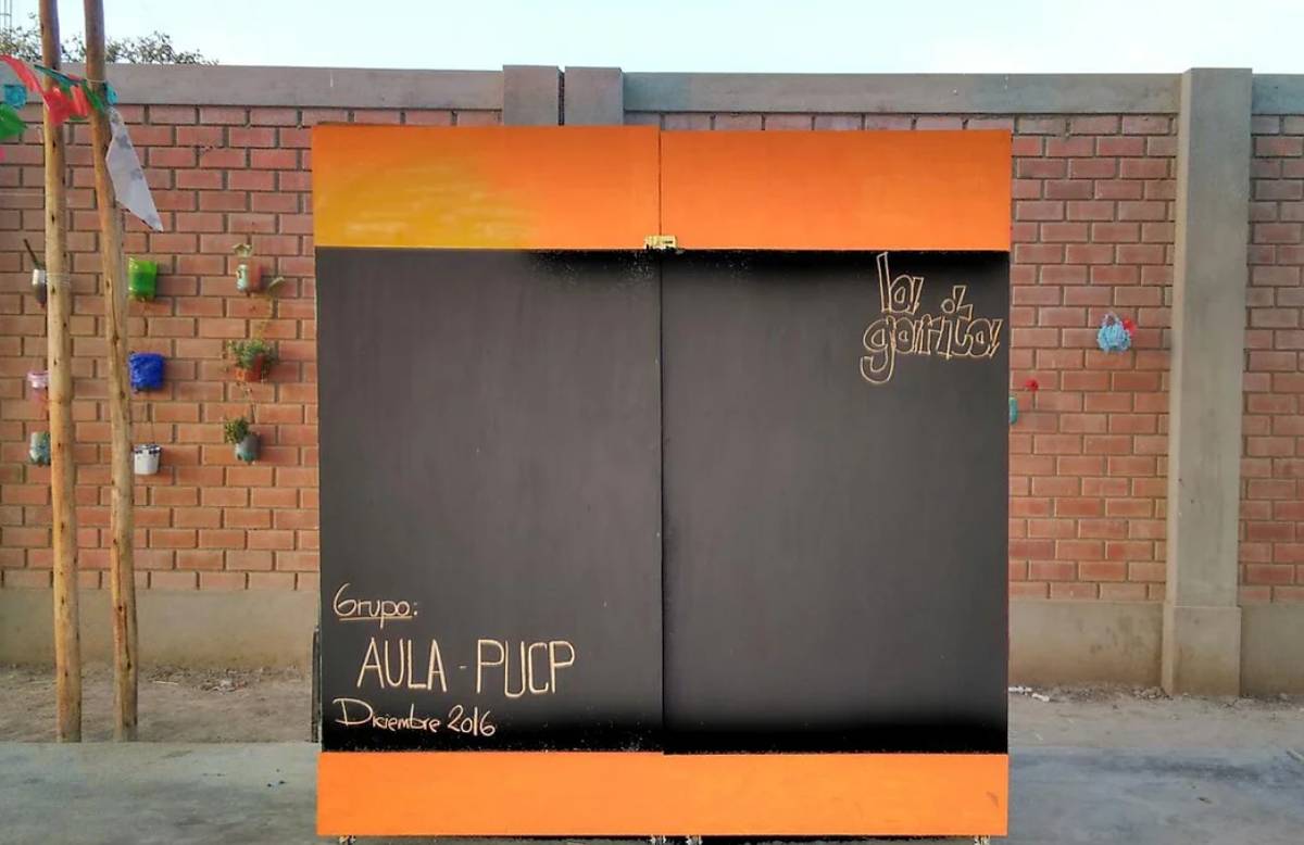 Se realizó un taller de Miniarquitectos con alumnos de 3ero a 5to grado de primaria con los cuales se reconoció la principal problemática del colegio, la falta de un espacio con las condiciones adecuadas para la toma de alimentos, ya que lo venían haciendo al aire libre sobre mobiliario en desuso (pupitres y bancas viejas o rotas). Identificado el problema se propuso a partir de sus ideas plasmadas en dibujos la elaboración de mobiliario lúdico de bancos y mesas fáciles de ensamblar, livianas, cómodas y “garabateables”. Así mismo se reusó un almacén de libros que por su mala ubicación no era usada por los niños, reciclando su estructura y convirtiéndola en una “retablo” que además de contener libros, al abrirse brindara cojines, juegos y fomentara la lectura al aire libre. La construcción del mobiliario se realizó junto a profesores, padres de familia y varios niños en 6 jornadas de trabajo.